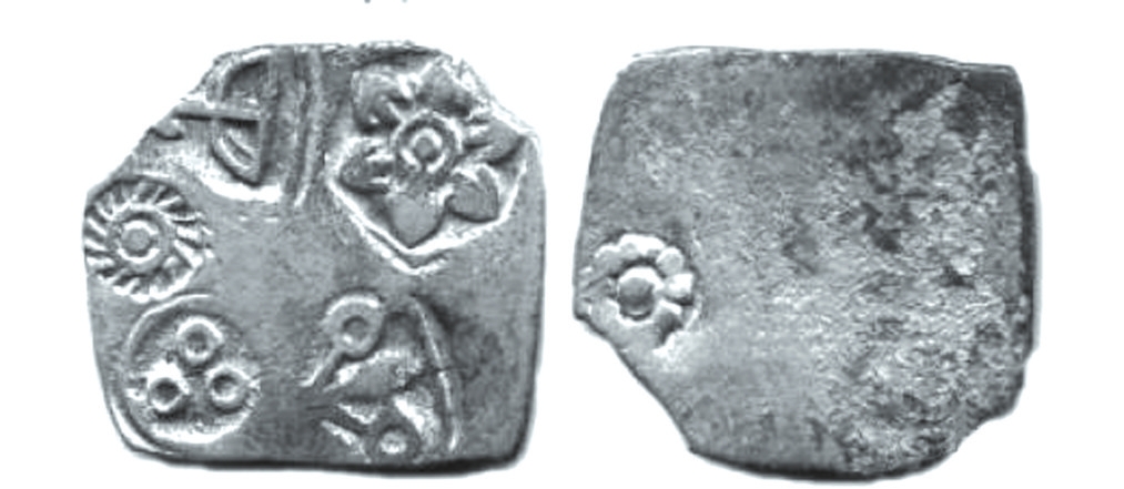 古印度摩揭陀國孔雀王朝時(shí)期的卡夏帕那銀幣,似乎可以為亞里士多德的說法提供佐證。卡夏帕那銀幣的具體起源時(shí)間不詳,其名源自重量單位“卡夏”,形制為切割成型的銀片或銀塊,正面加蓋戳記作為價(jià)值標(biāo)識(shí),戳記數(shù)量通常為一個(gè)至六個(gè)不等。早期的卡夏帕那銀幣可能由民間或地方勢力發(fā)行,其價(jià)值除了依托銀材本身的重量與成色,很大程度上取決于加蓋戳記的發(fā)行人或認(rèn)證人的信譽(yù)背書。
