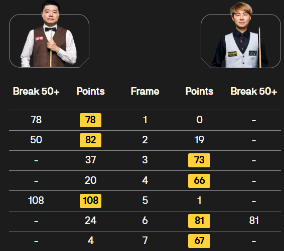丁俊暉與徐思比賽的比分?jǐn)?shù)據(jù)。圖片來(lái)自斯諾克世界大獎(jiǎng)賽官網(wǎng) 世界排名第九位的丁俊暉當(dāng)天開(kāi)局順利,以2:0取得領(lǐng)先,其中首局零封對(duì)手。27歲的徐思發(fā)起反擊,連追兩局,將比分扳成2:2。第五局,丁俊暉單桿轟出108分,以3:2再次領(lǐng)先,但世界排名第40位的徐思以81:24和67:4連下兩局,以4:3的總比分將丁俊暉淘汰出局。 其他比賽中,肖國(guó)棟以4:3戰(zhàn)勝杰克·瓊斯,蘇格蘭公開(kāi)賽冠軍雷佩凡以4:2擊敗斯萊塞,袁思俊以0:4不敵前世界冠軍羅伯遜,名將塞爾比和霍金斯也擊敗各自對(duì)手晉級(jí)第二輪。 6日將進(jìn)行第二輪比賽,肖國(guó)棟對(duì)陣?yán)着宸玻瑓且藵捎瓚?zhàn)賓漢姆。 (責(zé)任編輯:蔡文斌) |
