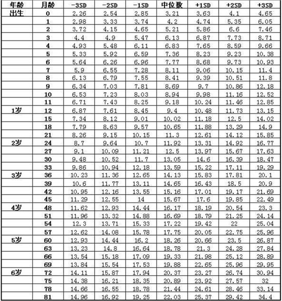 表2嬰幼兒童體重對照表(女)