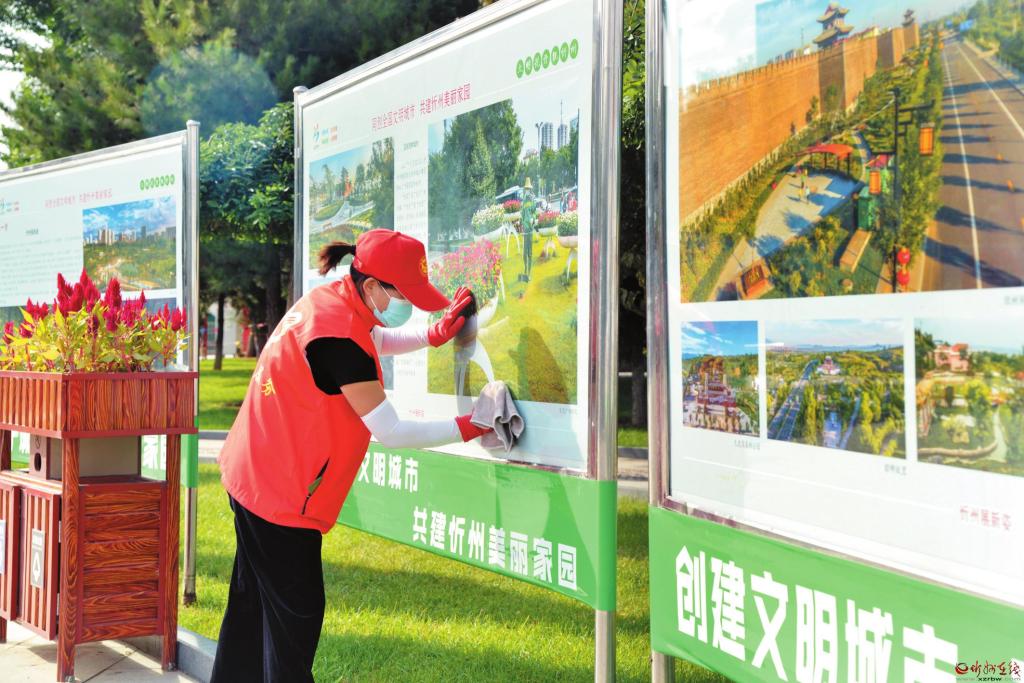 9月9日,市園林服務(wù)中心的志愿者正在忻州城區(qū)體育廣場清潔宣傳欄。眼下正處于創(chuàng)建全國文明城市的攻堅階段,忻州市各單位的志愿者紛紛走上街頭、廣場、小區(qū),為創(chuàng)文助力。 張存良 攝