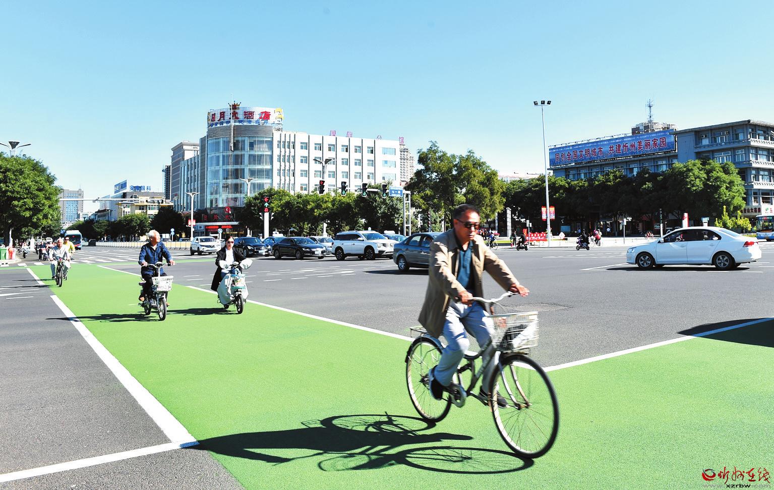 9月3日,市民在忻州城區(qū)七一路與長(zhǎng)征街交叉路口的自行車(chē)專(zhuān)用道上騎行。日前,忻州路面上出現(xiàn)人車(chē)分離“斑馬線”,行人走斑馬線、騎行則走專(zhuān)用自行車(chē)道,很好地實(shí)現(xiàn)了人和非機(jī)動(dòng)車(chē)分流通過(guò),為創(chuàng)建文明城市增色。 宮清華 攝