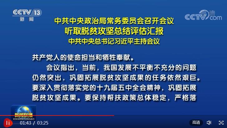 12月3日,中共中央政治局常務委員會召開會議,聽取脫貧攻堅總結評估匯報。習近平總書記主持會議并發(fā)表重要講話。在講話中,總書記總結了黨的十八大以來脫貧攻堅工作取得的成績,肯定了各級黨委和政府以及社會協(xié)同發(fā)力、合力攻堅的卓越付出。央視網(wǎng)《聯(lián)播+》特梳理講話及會議要點,以饗讀者。