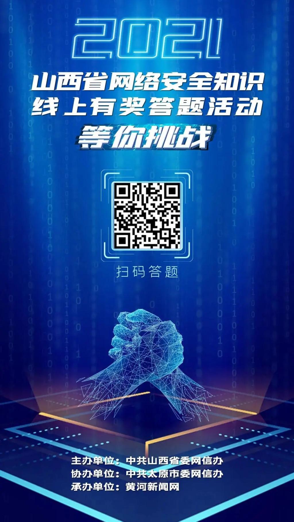 為深入宣傳貫徹《中華人民共和國網(wǎng)絡(luò)安全法》等相關(guān)法律法規(guī),進(jìn)一步普及網(wǎng)絡(luò)安全知識,提升全社會網(wǎng)絡(luò)安全意識和防護(hù)技能,在2021年國家網(wǎng)絡(luò)安全宣傳周期間,由中共山西省委網(wǎng)信辦主辦、中共太原市委網(wǎng)信辦協(xié)辦、黃河新聞網(wǎng)承辦的“2021山西省網(wǎng)絡(luò)安全知識線上有獎答題活動”于10月9日正式啟動。