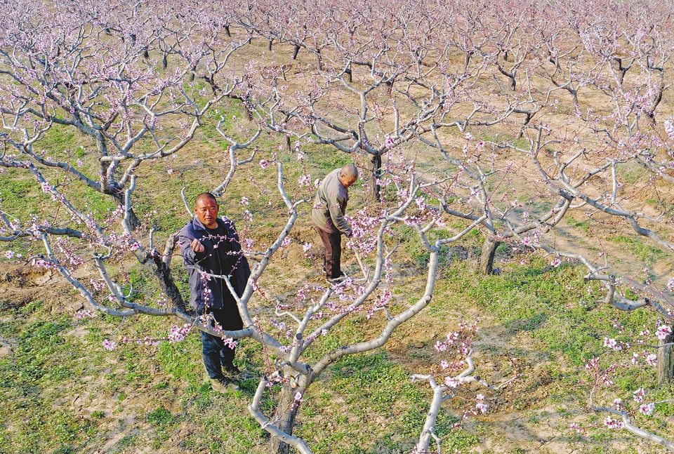 3月30日,在臨汾市襄汾縣大鄧鄉(xiāng)上西梁村,果農(nóng)在桃園開展春管作業(yè)。日前,上西梁村上百畝桃樹進(jìn)入盛花期,當(dāng)?shù)剞r(nóng)民搶抓農(nóng)時對桃園開展追肥、灌溉、疏花等系列農(nóng)事活動,確保果樹正常生長、果實優(yōu)質(zhì)高產(chǎn)。李現(xiàn)俊攝