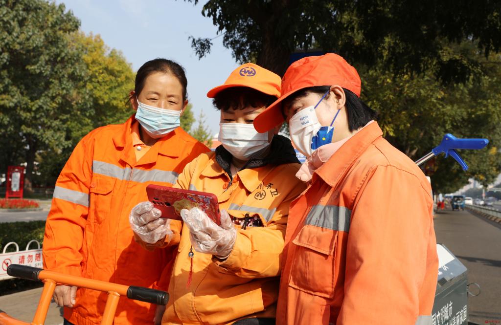 忻州街頭環(huán)衛(wèi)工人工作間隙收看大會(huì)。范濤 攝
