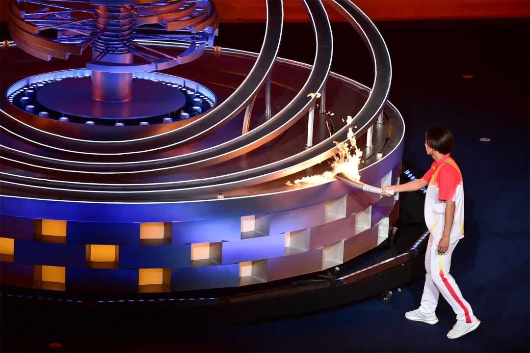 開幕式之夜,最為激動(dòng)人心的就是點(diǎn)火時(shí)刻。在射擊世界冠軍張益梵、鄉(xiāng)村干部王春、環(huán)衛(wèi)工人孫秀蘭、大國工匠官生花、公交司機(jī)馮冰依次傳遞過后,火炬來到了最后一棒火炬手、北京冬奧會冠軍蘇翊鳴的手中。主火炬塔點(diǎn)火裝置以山西民俗“旺火”為設(shè)計(jì)依據(jù),采用清潔能源“微火”點(diǎn)燃的方式。蘇翊鳴手持火炬,在萬眾矚目之下,以“微火”點(diǎn)“旺火”,歷史、現(xiàn)在與未來,在這一刻融匯賡續(xù)。