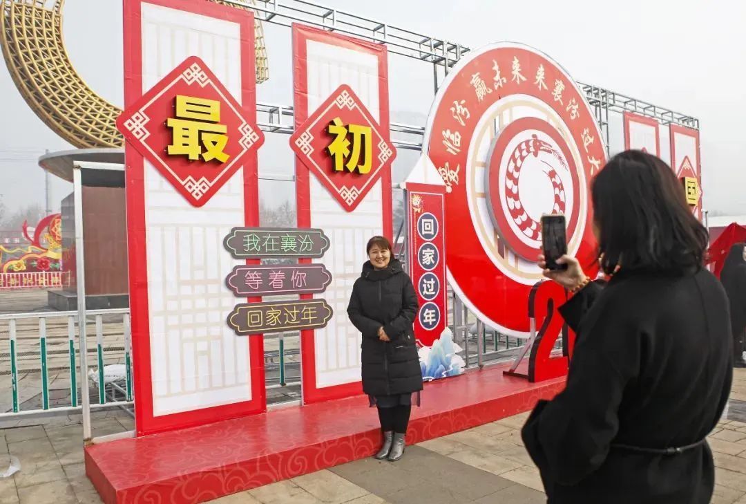 在臨汾,人們在襄汾丁陶文化廣場內(nèi)陶寺龍盤展板前拍照,歡度新春佳節(jié);
