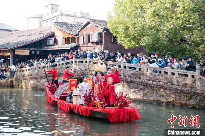 在浙江紹興安昌古鎮(zhèn),記者到訪時,在碧水之上,一場明制婚禮正在舉行,再現(xiàn)了烏篷船接親的當?shù)鼗樗?。從單純表演到定制化服務,今年“五一”假期就有新人預訂了自己的水上婚禮。