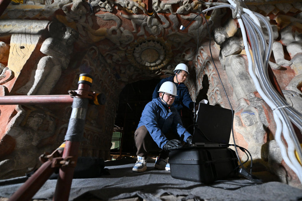 云岡研究院數(shù)字化保護中心工作人員潘鵬(前)和同事杜強在云岡石窟第10窟進行數(shù)據(jù)采集(2024年2月27日攝)。
