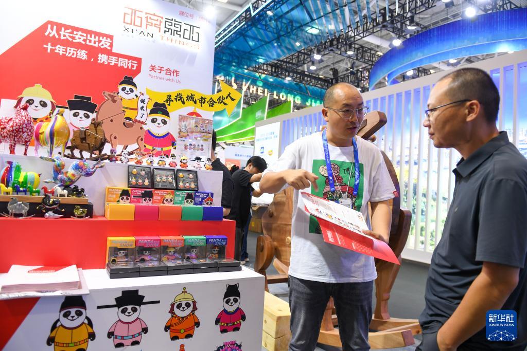5月23日,參展商在第二十屆文博會上向參觀者介紹文創(chuàng)產品。(新華社記者 毛思倩 攝)