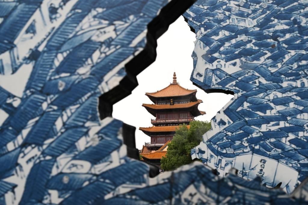 透過創(chuàng)意青花瓷片拍攝的龍珠閣。新華社記者 隋尚君 攝