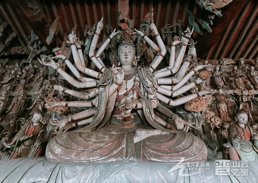 千手觀音像。牛牧瑤 攝 寺內(nèi)擁有總計(jì)2000多尊彩塑,大者丈余、小者尺許,每一壁龕為一獨(dú)立神話或佛教故事,人物造型生動(dòng),神態(tài)逼真,尤其以“千手觀音像”與“韋馱像”最為經(jīng)典。舞蹈《千手觀音》的靈感原型就是這尊千手觀音像。塑像高達(dá)數(shù)米,全身貼金,背后伸出上千只手臂,每只手掌上都有一只眼睛,錯(cuò)落有致,整個(gè)造像氣勢(shì)恢宏,達(dá)到雕塑藝術(shù)中和諧、完美的境界。韋馱像巍然肅立,身披甲胄,神情凝重,整個(gè)身體呈現(xiàn)出一種微妙的動(dòng)態(tài)平衡,是明代彩塑中少見(jiàn)的藝術(shù)杰作,被譽(yù)為“天下第一韋馱”“全國(guó)韋馱之冠”。景區(qū)講解員侯麗娟介紹:“這尊塑像的高明之處就在于匠師不落俗套,打破了一般程式的限制,賦予了韋馱一種時(shí)間的節(jié)奏性和動(dòng)作的連續(xù)性,產(chǎn)生了雕塑作品的最高境界‘不動(dòng)之動(dòng)’?!?/p>