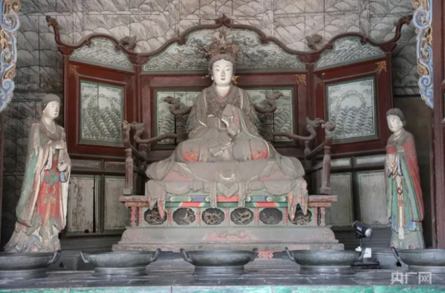 外觀玲瓏似涼亭——獻殿。獻殿是給圣母殿邑姜供奉祭品的享堂,始建于金大定八年(1168),明萬歷二十二年(1594)重修。獻殿高9.75米,其梁架節(jié)省材料且堅固,斗拱結(jié)構(gòu)疏朗,外觀玲瓏似涼亭。