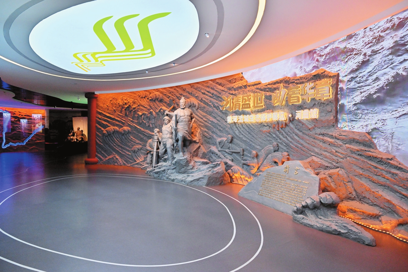 在第五篇章“大河之夢(mèng)·生態(tài)和諧”展區(qū)的弧幕影院里,《河清盛世曲著華章》主題影片展現(xiàn)著新時(shí)代圖景:國家園林縣城的林蔭道上,光伏板與古長(zhǎng)城交相輝映;黃河濕地公園里,黑鸛與白天鵝掠過水面;整溝治理后的山坡上,民宿集群飄起裊裊炊煙。